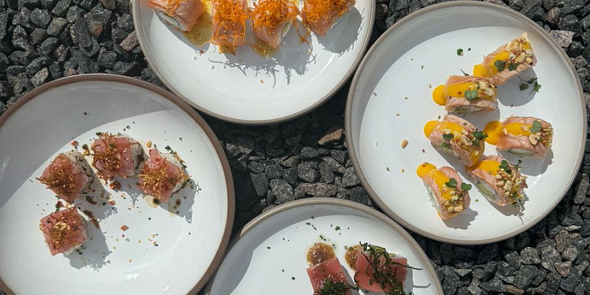 Что было в меню: Ролл татаки с кукурузным дрессингом, ролл с лососем «Апельсин-понзу», обури-суши с тунцом, суши с тунцом и маринованным луком, темпура из форели с соусом манго.